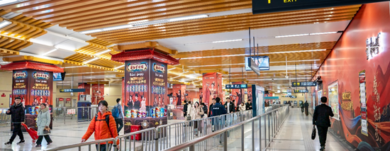 • 结构剧情化:对站厅立柱进行包柱视觉改造设计,部分结合唐代屋檐造型,打破平面局限,增强戏剧张力。这种设计使广告位不再是简单的信息展示,而是成为故事情境的延伸。
